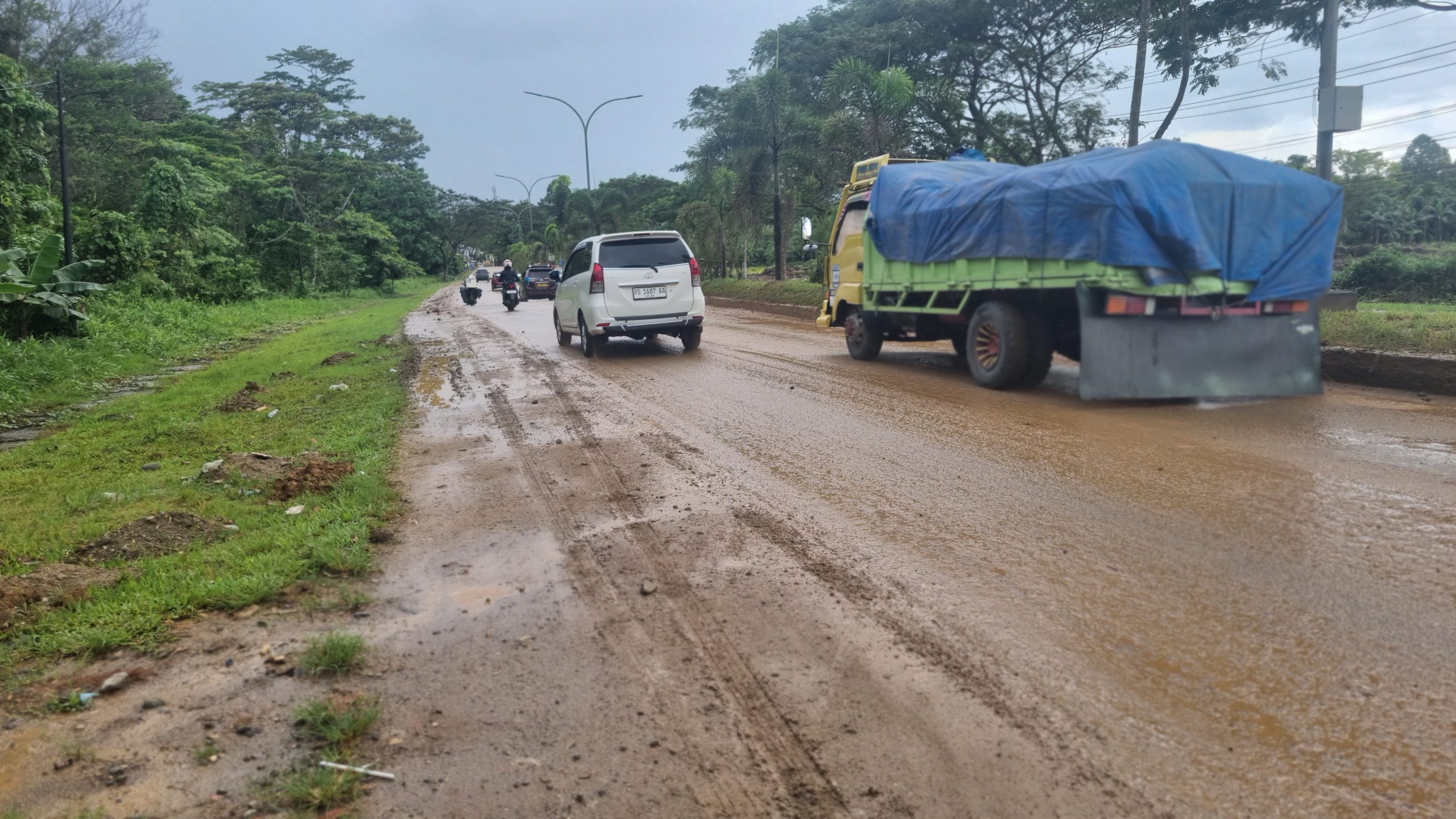 Tanah tersebut bercampur air hujan, membentuk genangan lumpur yang licin dan membahayakan pengguna jalan.